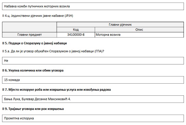 Za isporuku kombija zadužen je banjalučki „Auto Servis NV“ Banjaluka i to po cijeni od 875.250 KM. Uz ovo trebalo bi svakako naglasiti i da je upravo MUP prije samo dva mjeseca kupio četiri polovna automobila za šta je isplatio 117.000 KM.Iako ministar Lukač prošlog mjeseca nije objasnio zbog čega je budžet probijen, napomenuo je da je ova godina specifična po mnogo čemu, a posebno po tome što je izborna.