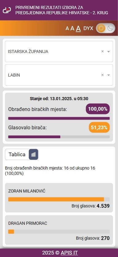 Podsjetimo, u prvom krugu Milanović je u Labinu imao 72.42 odsto ili 3293 glasa s nešto manjom izlaznošću, 47.81 odsto.