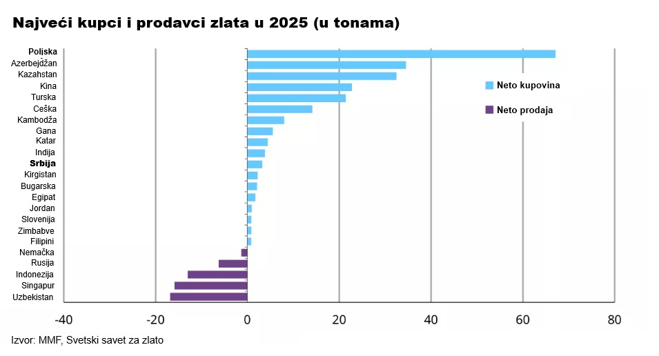 "Uprkos nedavnoj pauzi u akumulaciji, NBP ostaje vodeći kupac ove godine. Dodali su 67 tona zlatnih rezervi od početka godine. Ukupne zalihe zlata krajem avgusta iznosile su 515 tona", navodi se u analizi.