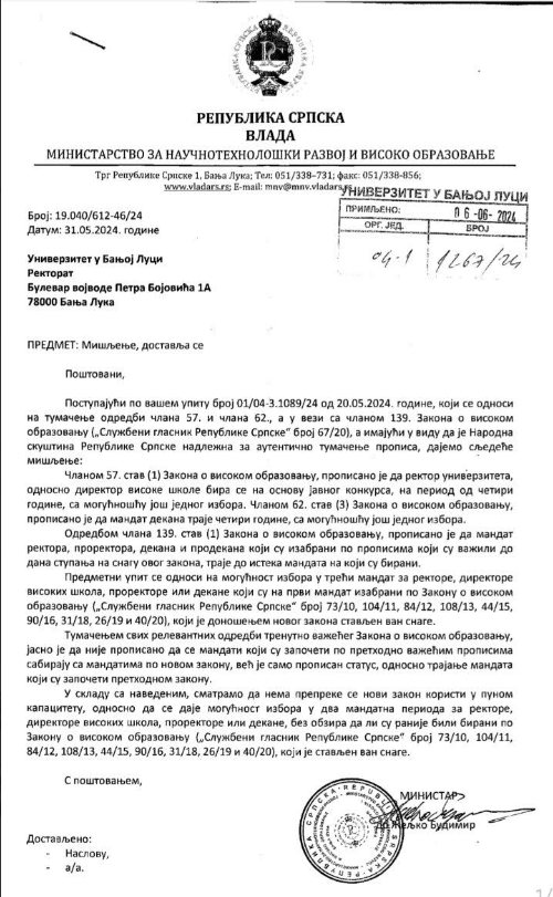 Ono, očigledno po prethodnom dogovoru sa moćnicima, i po principu "ajde neka nama Univerzitet u Banjaluci postavi upit da li može ponovo biti rektor, a mi ćemo zvanično reći da može", iako je to suprotno novom Zakonu o visokom obrazovanju i prethodnoj argumentaciji, odgovara Univerzitetu u Banjaluci kako, suštinski kazano, navodno nema smetnji da aktuelni rektor Univerziteta u Banjaluci i po treći put konkuriše, jer, navodno, novim Zakonom o visokom obrazovanju "nije propisano da se mandati koji su započeti po prethodno važećim propisima sabiraju sa mandatima po novom zakonu".
