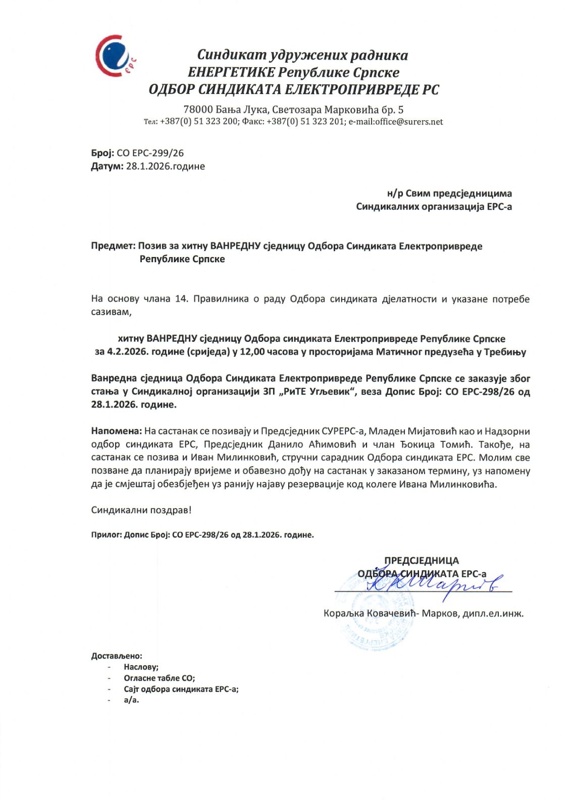 "Na osnovu člana 14. Pravilnika o radu Odbora sindikata djelatnosti i ukazane potrebe sazivam, hitnu VANREDNU sjednicu Odbora sindikata Elektroprivrede Republike Srpske za 4.2.2026. godine (srijeda) u 12,00 časova u prostorijama Matičnog preduzeća u Trebinju", stoji u dopisu Sindikata.