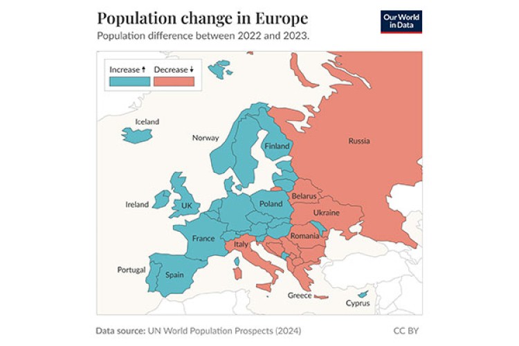 Тако су на мапи Европе западне земље плаве (означавајући раст), док простор бивше Југославије и остатак Балкана остају у црвеној зони. Овај регион, уз јужну Европу, предњачи по негативним популационим промјенама. Стручњаци наглашавају да ово није случајан инцидент, већ дугорочни образац који траје деценијама.