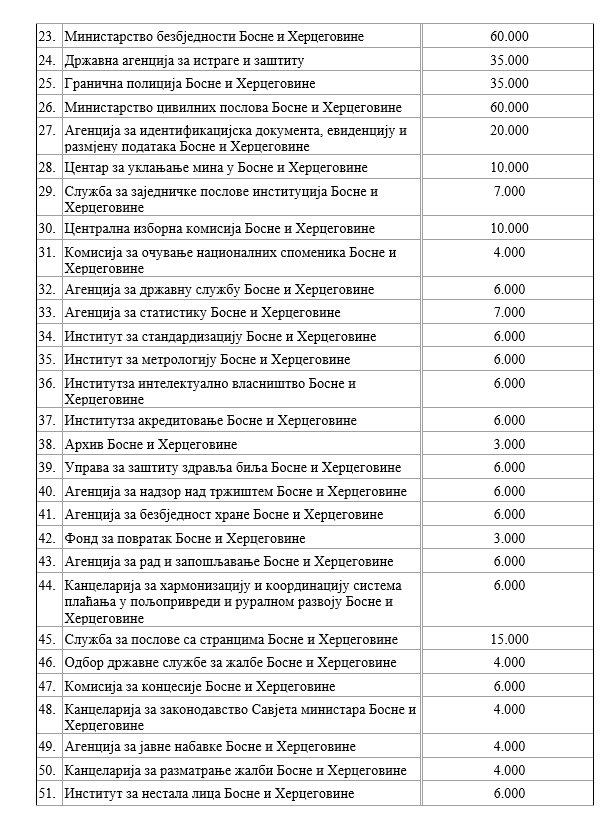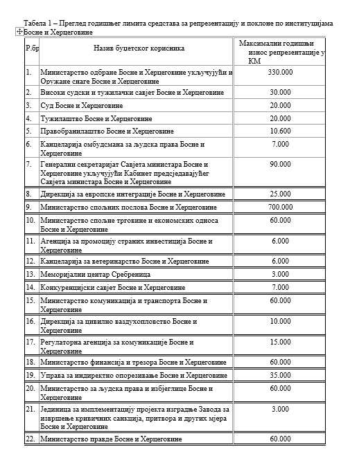 Када је ријеч о конкретним износима, већина институција задржава исти лимит као у важећем правилнику, али Министарству иностраних послова БиХ износ репрезентације повећава се са 500.000 КМ на 700.000 КМ годишње, што је повећање од 200.000 КМ.