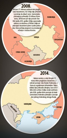 Što se tiče Krima i Kosova, zajedničko im je i to što je u oba slučaja primjenjena metoda svršenog čina. Srbija ne priznaje Kosovo, baš kao ni Ukrajina to što je Krim pripojen Rusiji, međutim, situacija na terenu je faktički takva da Kosovo u najvećoj mjeri funkcioniše kao samostalna država, članica međunarodnih organizacija (osim UN) i učesnica svih sportskih takmičenja, a Ukrajina nema ama baš nikakva ovlašćenja na Krimu.
