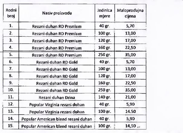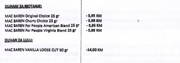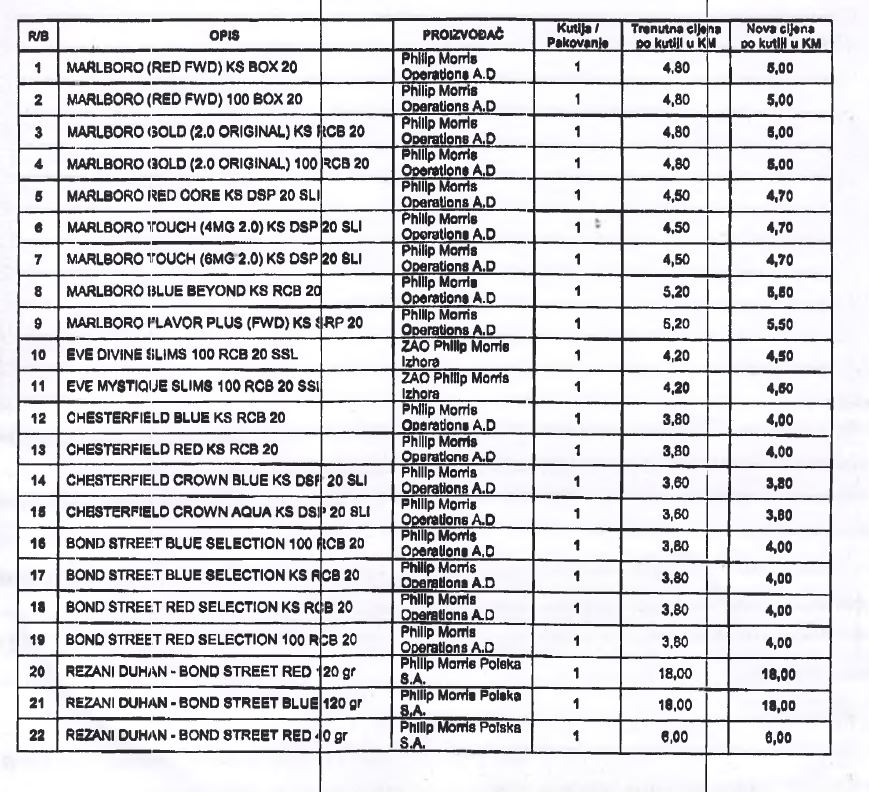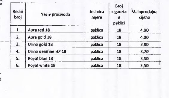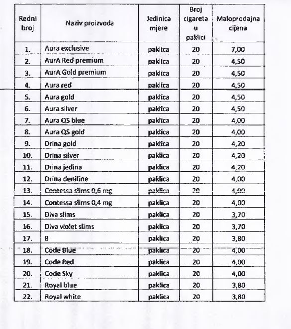 Odlukom o utvrđivanju posebne i minimalne akcize na cigarete i iznos akcize na duhan za pušenje za 2016. godinu je definisano da će se od 1. januara 2017. godine, na cigarete plaćati proporcionalna akciza po stopi od 42 odsto maloprodajne cijene cigareta i specifična akciza u iznosu od 67,50 KM za 1.000 komada, odnosno 1,35 KM za pakovanje od 20 komada.