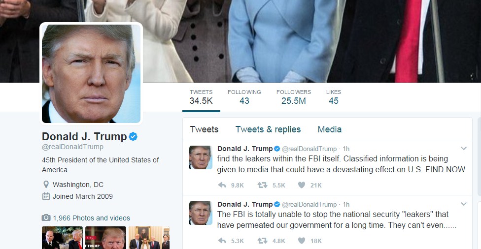 "FBI je totalno nesposoban da zaustavi curenje o nacionalnoj sigurnosti koje već dugo podrivaju našu vladu. Čak nisu u stanju..., glasi prvi twitt, na koji se nadovezuje sljedeći: