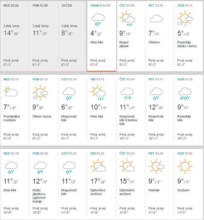 08.03.2017 17:12Kako ništa od proljeća? Pa, ovo je baš period ovakvog vremena, proljeće tek u punom sjaju počinje iza 20.aprila u ovim krajevima, a tada i jeste kalendarski. Još je zima aktuelna.