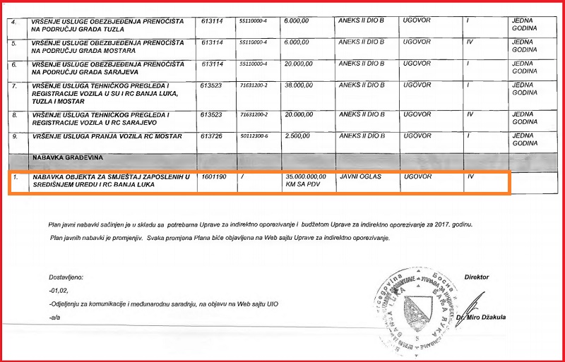 Prema planu javnih nabavki za 2017. godinu, Uprava za indirektno oporezivanje BiH predvidjela je kupovinu poslovne zgrade, odnosno "nabavku objekta za smještaj zaposlenih u središnjem u redu u RC Banjaluka". Za ovu namjenu predviđeno je 35.000.000 KM, a iznos uključuje i PDV.
