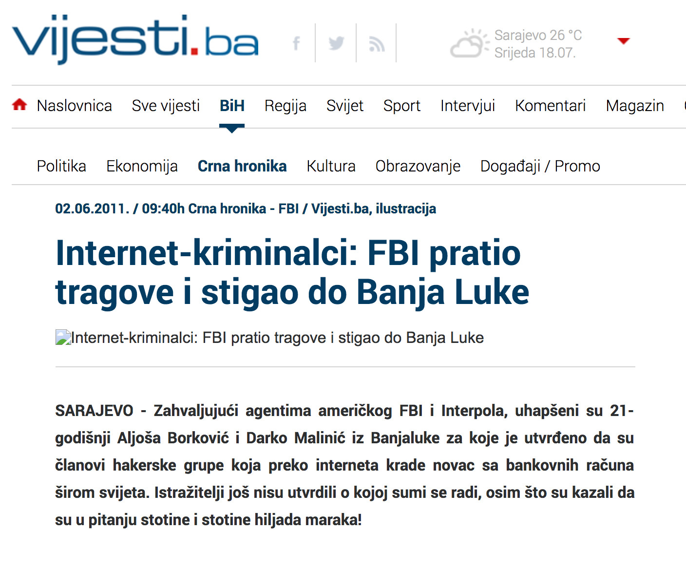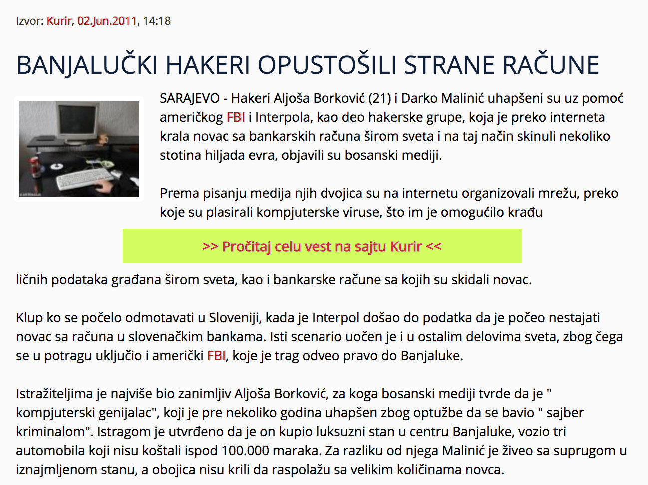 Dodatak 1: Vijesti.ba/Internet-kriminalci: FBI pratio tragove i stigao do Banja Luke (02.06.2011.)