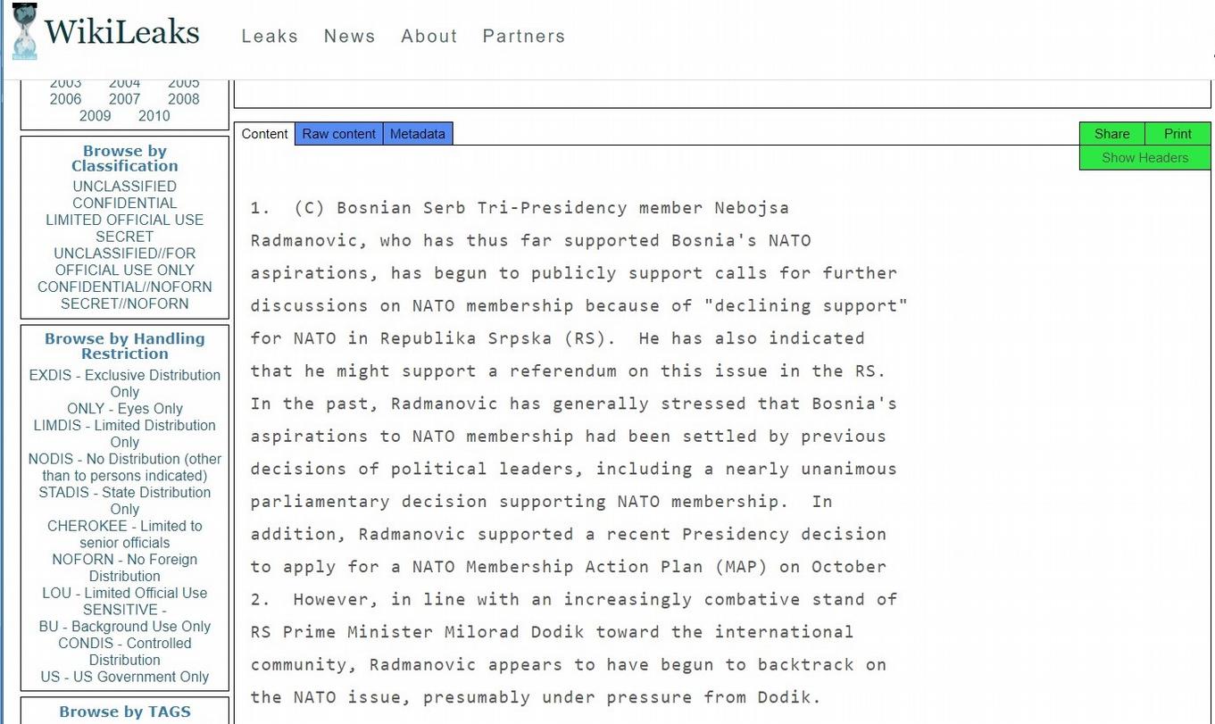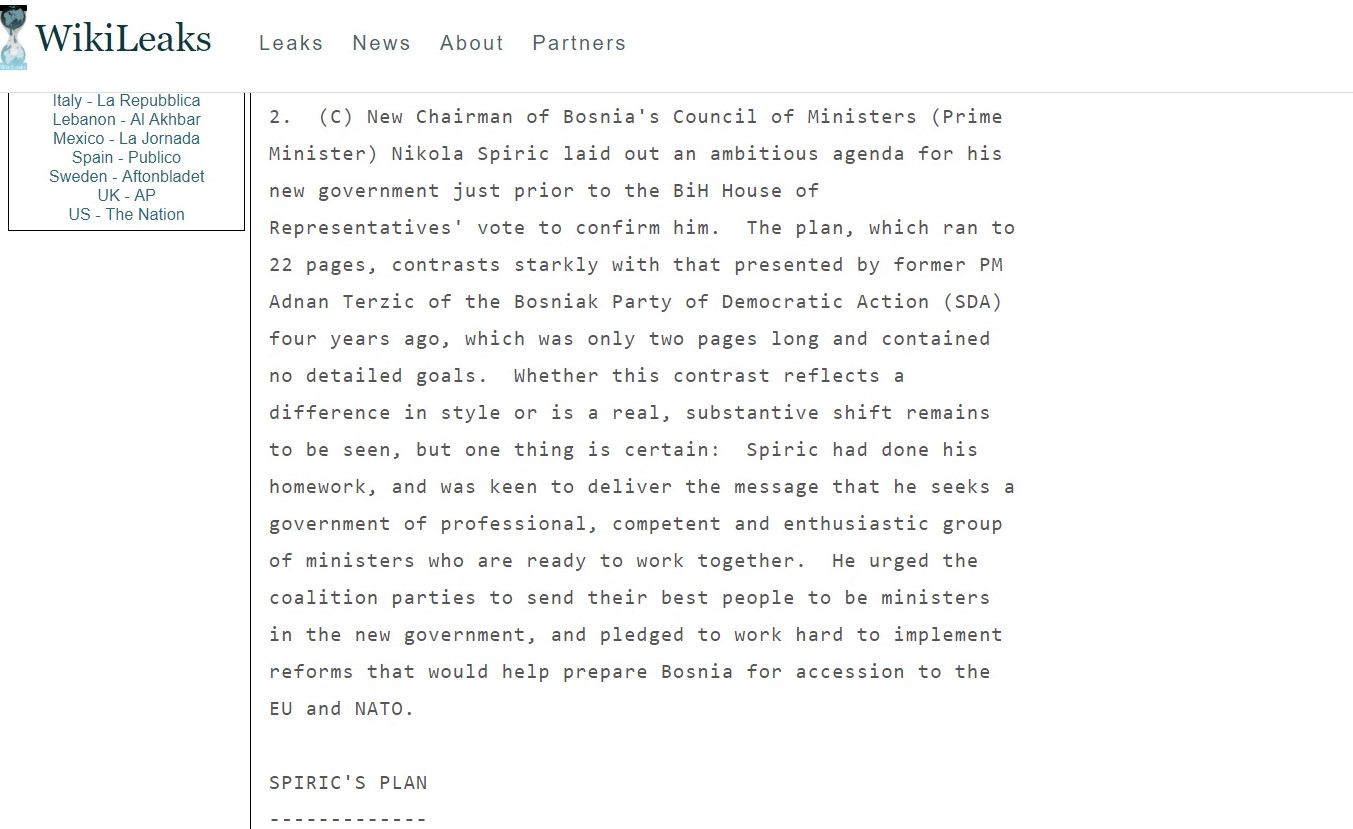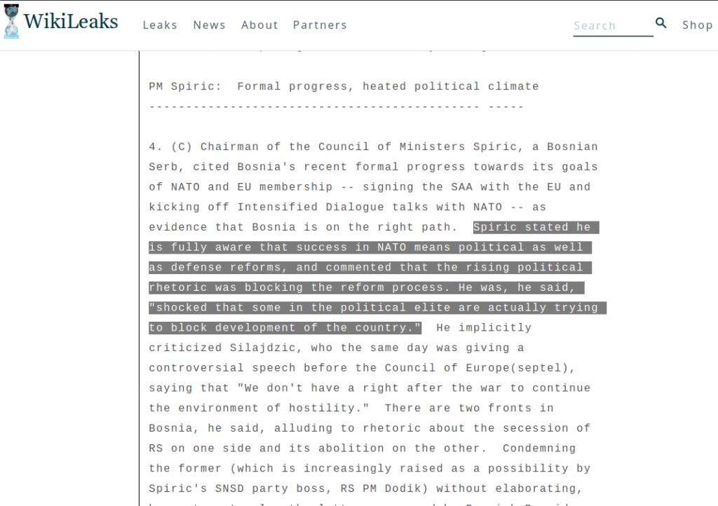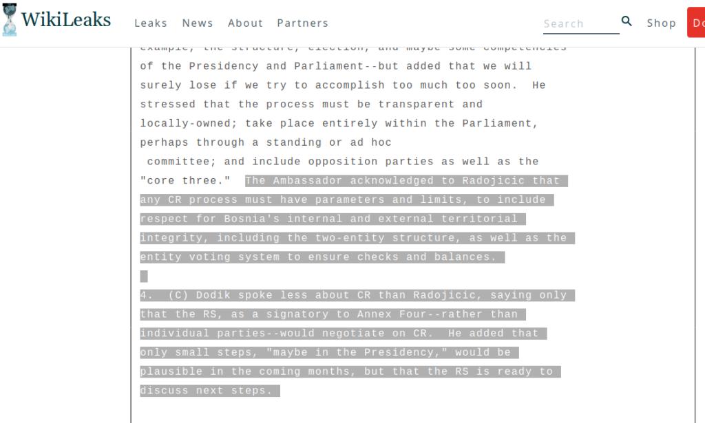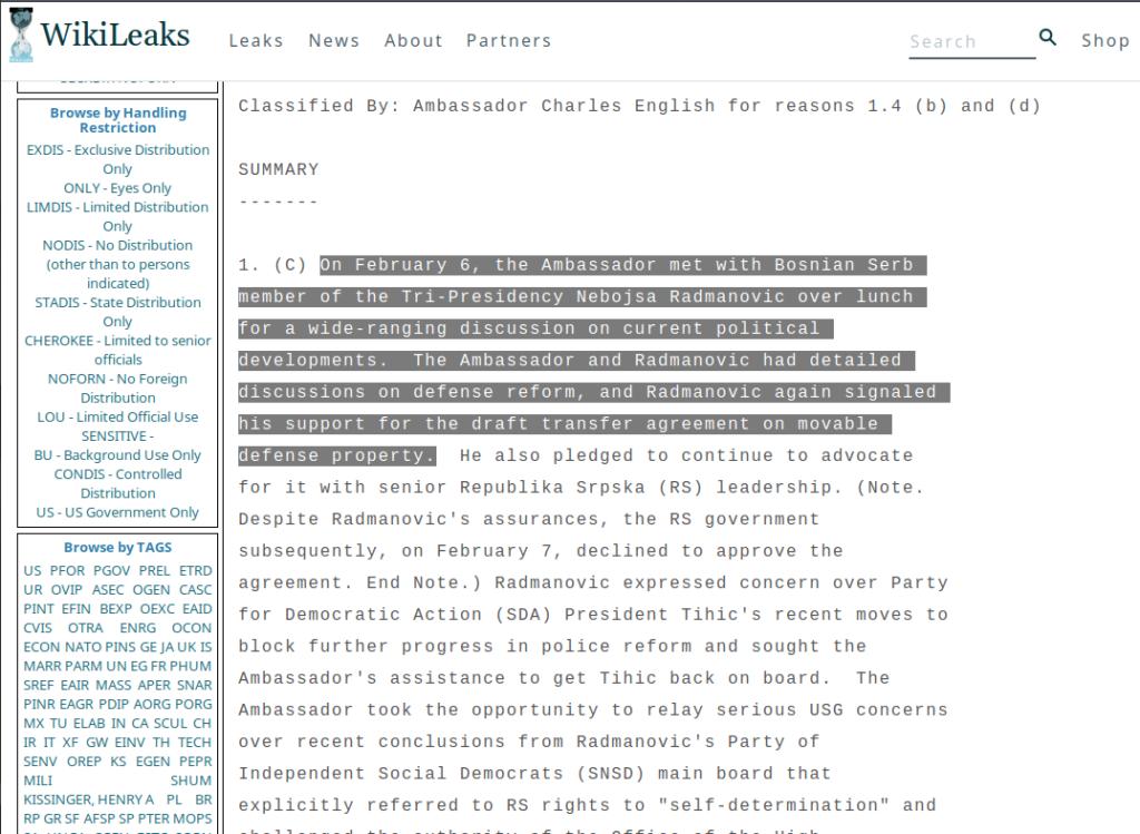 Istraživanjem baze pomenutog sajta, dolazi se do informacija i svojevremenih izjava najviših funkcionera SNSD-a po pitanju međunarodnih odnosa, pristupanja Bosne i Hercegovine NATO-u, Prudskog sporazuma.