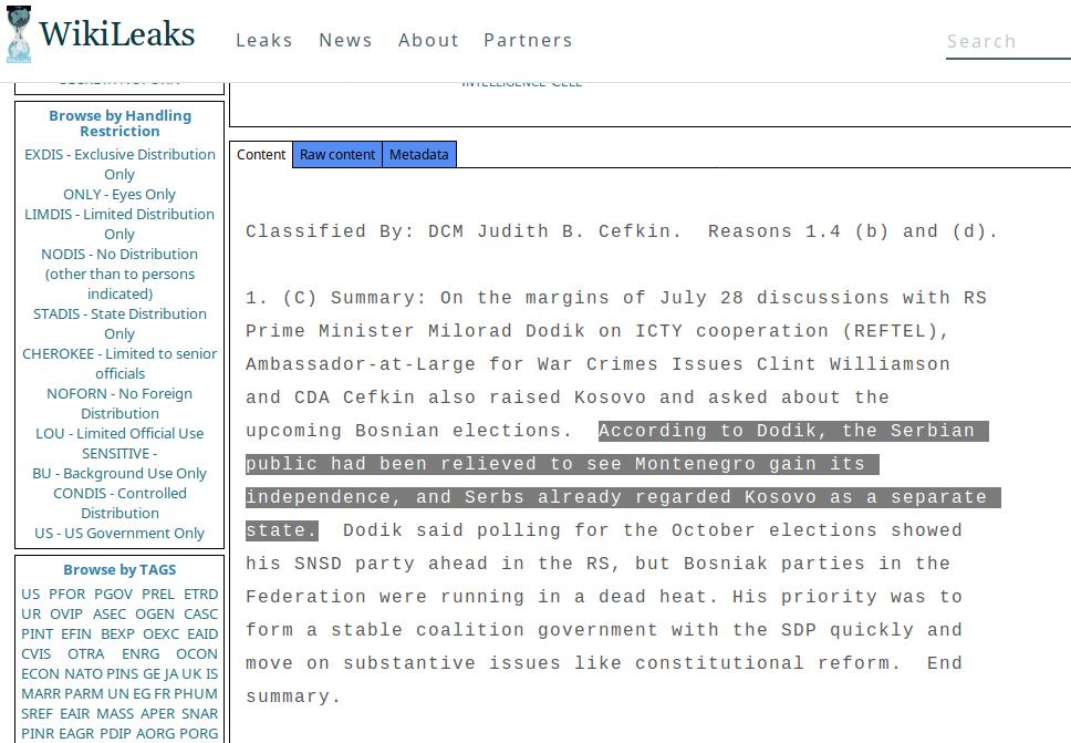 Zanimljiv je i telegraf koji pokazuje kako je Dodik još 2006. stranim diplomatama saopštavao kako vidi Kosovo kao nezavisnu državu, odvojenu od Srbije. Tada je takođe govorio sa oduševljenjem o proglašenju nezavisnosti Crne Gore.