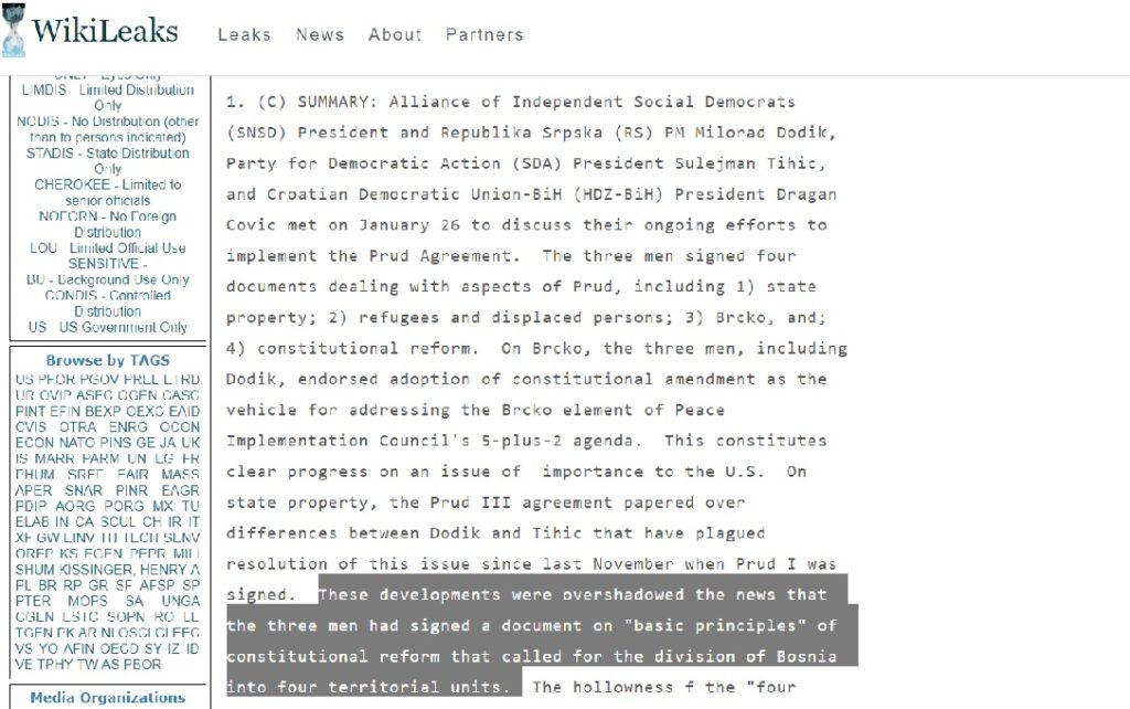 „Predsjednik Saveza nezavisnih socijaldemokrata (SNSD) i premijer RS Milorad Dodik, Sulejman Tihić (SDA) i predsjednik HDZ-a BiH – Dragan Čović, potpisali su dokument o „osnovnim principima“ ustavne reforme koja je pozvala na podjelu Bosne i Hercegovine u 4 teritorijalne jedinice.“