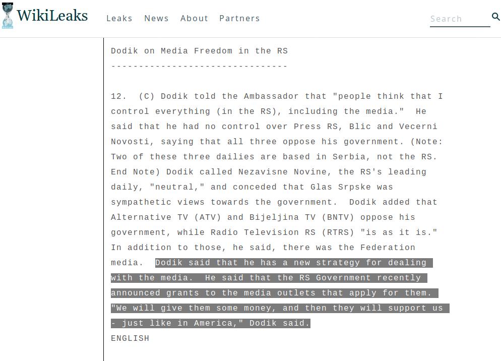 Zanimljivo je i obećanje Milorada Dodika dato 2009. godine dato stranom diplomati kako će u djelo sprovesti novu strategiju za nošenje sa medijima. Tada je potvrdio da je Vlada Republike Srpske objavila grantove za medijske kuće za koje one treba da apliciraju.