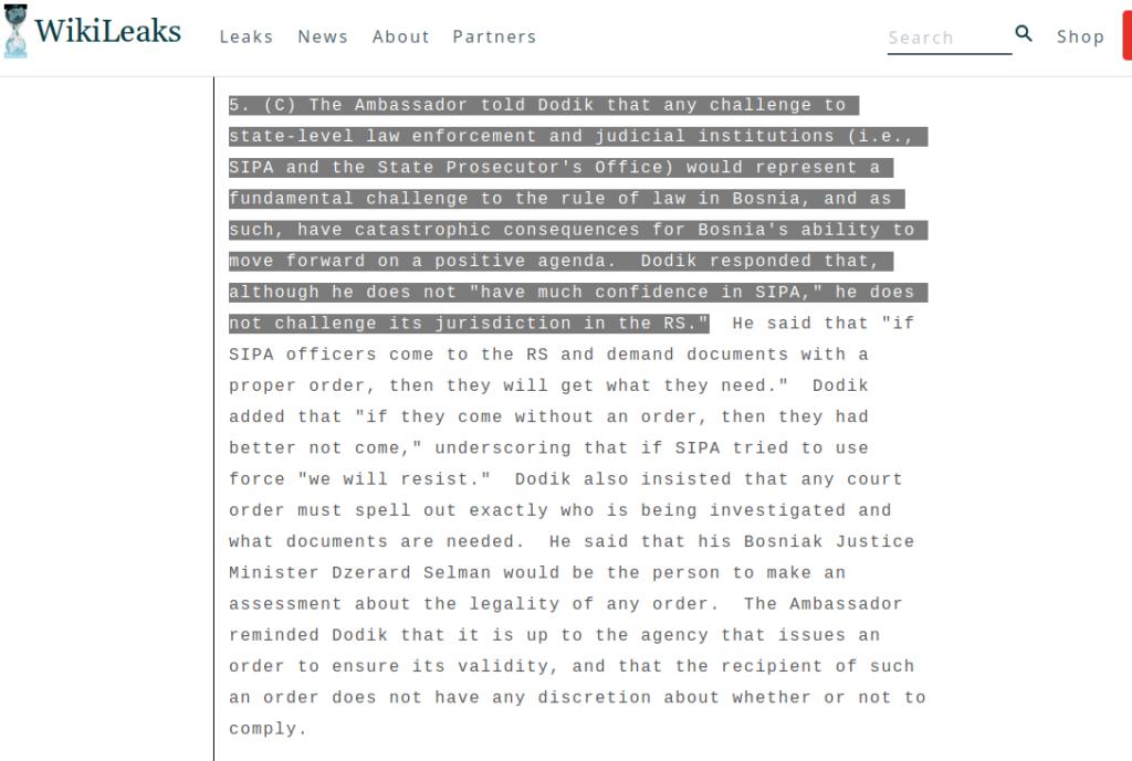 2008. godine, u oktobru Dodik se susreo sa Čarlsom Inglišem, Milorad Dodik je potvrdio da „iako nema mnogo povjerenja u SIPA-u“ on ne osporava jurisdikciju ove agencije na teritoriji Republike Srpske. U nastavku razgovora Dodik je pokušao da objasni da se neće opirati bilo kakvom pretresu koji bi poduzimala SIPA, ukoliko se dostavi validan nalog.
