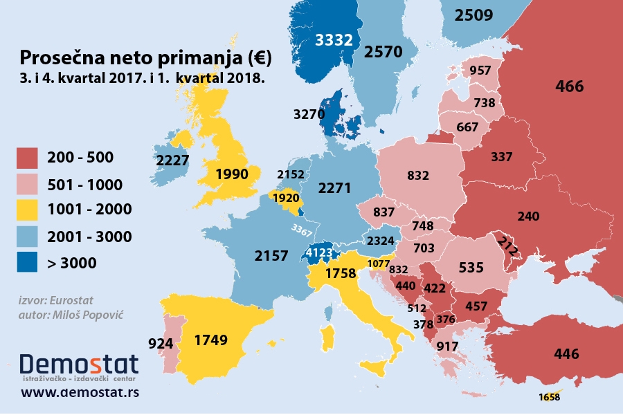 Prema podacima koje je objavio sajt Demostat.rs, pozivajći se na Eurostat, u prvom kvartalu ove godine plata u Bosni i Hercegovini 440 eura, Crnoj Gori 512 eura, Hrvatskoj 832 eura, Sloveniji 1.077, Mađarskoj 703, Rumuniji 535, Bugarskoj 457 eura a koliko iznose u ostatku Evrope pogledajte u infografici u nastavku.