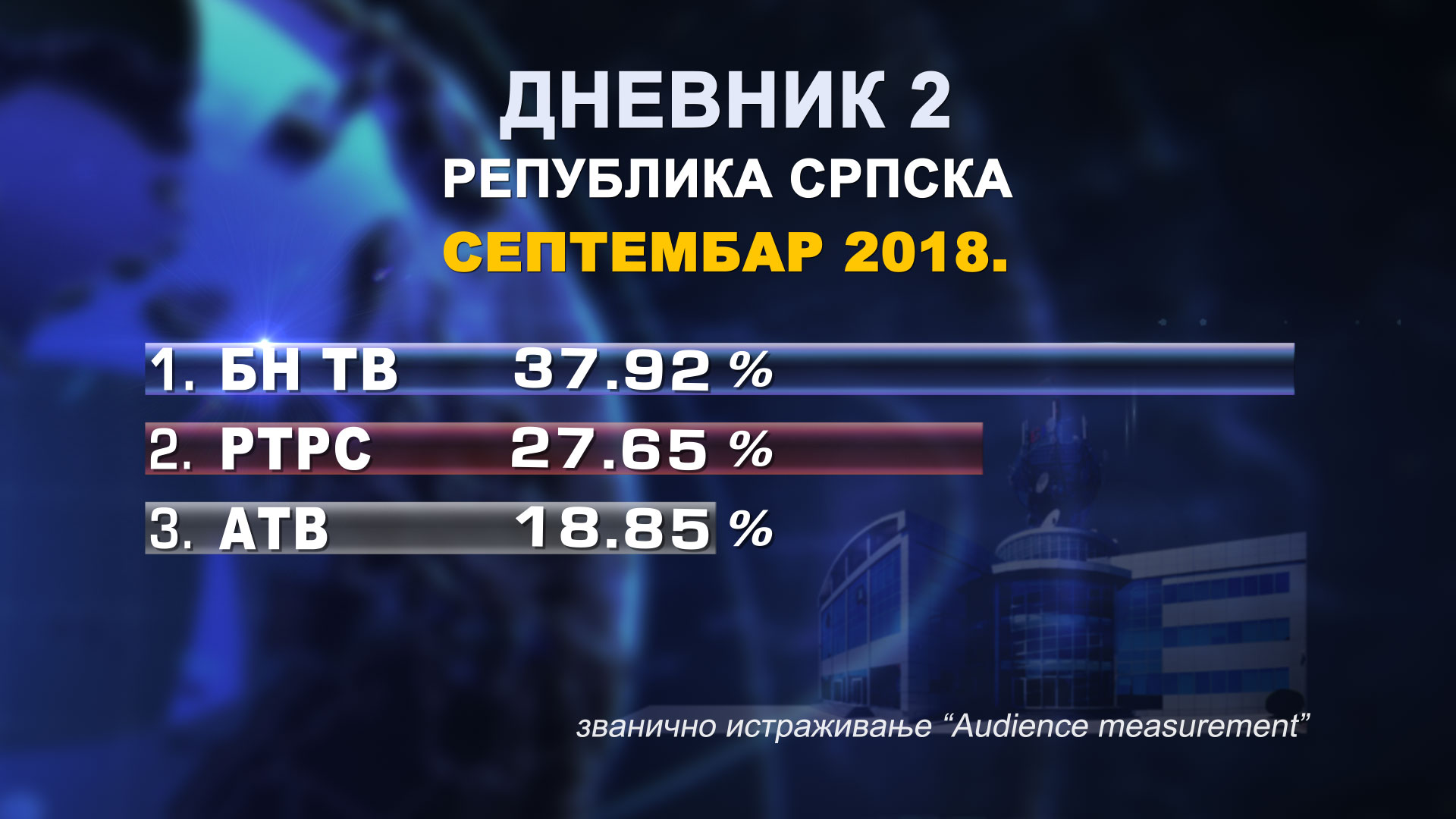 Dnevnik BN televizije je i dalje najgledanija centralna informativna emisija na teritoriji Republike Srpske. Šer Dnevnika 2 BN TV u septembru iznosio je 37,92 % i bio je gledaniji u odnosu za avgust za 10%.