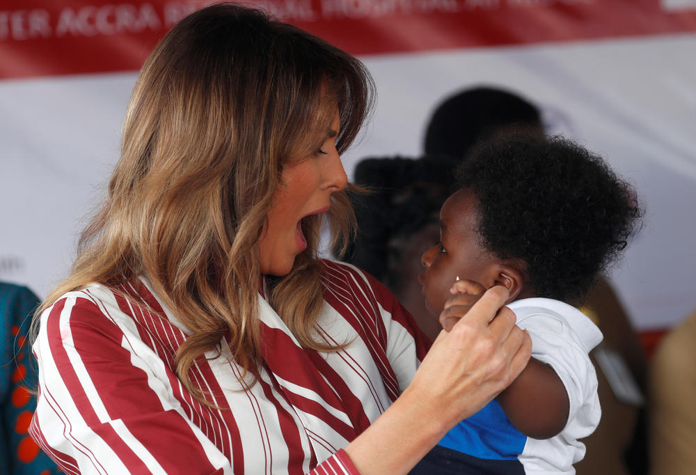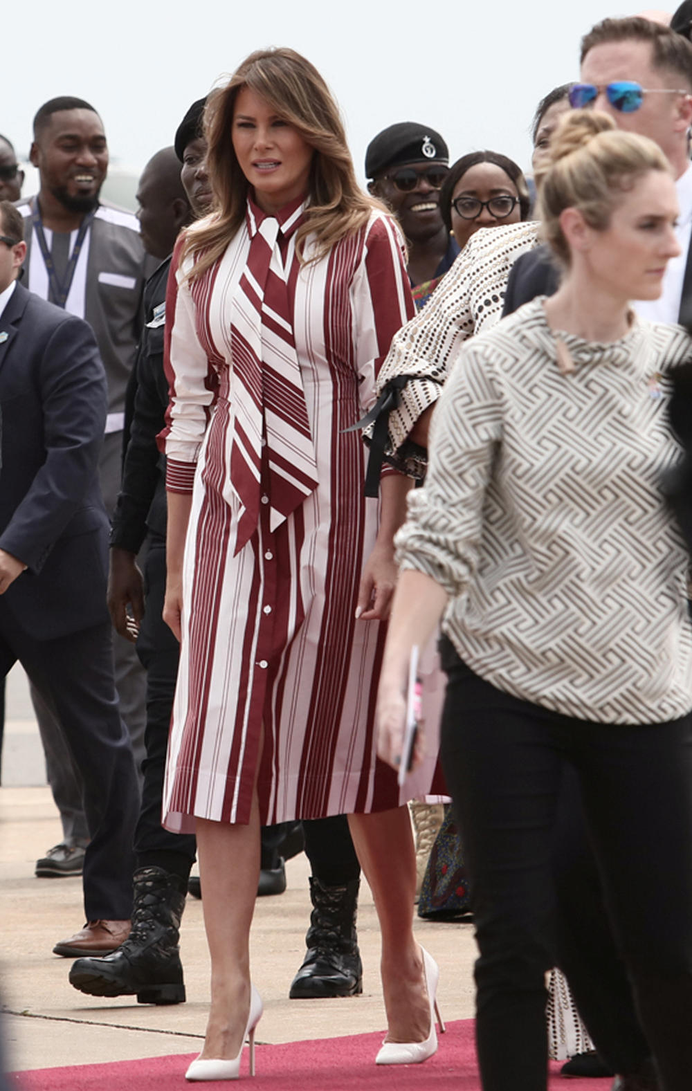 Prva dama Amerike izgledala je zanosno kada je stigla na aerodom Kotoka i Akri. Za ovu priliku, Melanija je odabrala borbo-belu košulja haljinu bredna Selin i njene omiljene salonke u beloj boji, brenda Manolo Blanik.