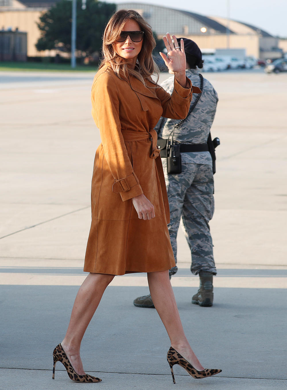 Još jedna odevna kombinacija koja je privula pažnju jeste ona koju je odabrala kada je iz vojne baze Merilend kretala na put. Ovaj put odabrala je smeđu kombinaciju, a poseban utisak ostavila je odabirom cipela.