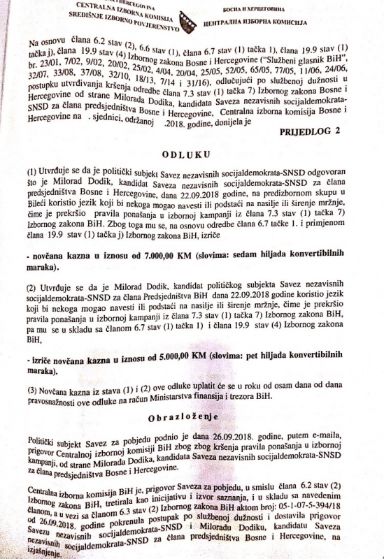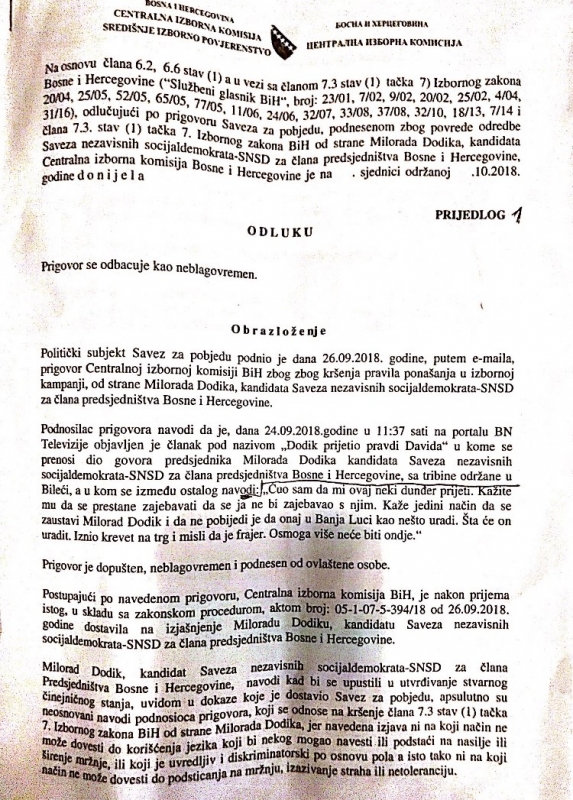Pravna služba Centralne izborne komisije BiH, odlučujući po prigovoru Saveza za pobjedu, donosi odluku kojom „prigovor odbacuje kao neblagovremen“. U obrazloženju prijedloga odluke koja je juče razmatrana na Kolegiju CIK-a navedeno je da je „Centralna izborna komisija razmatrala predmetni prigovor i po službenoj dužnosti i ocijenila da riječi izrečene na tribini Milorada Dodika... ne predstavljaju povredu odredbe Izbornog zakona BIH“.