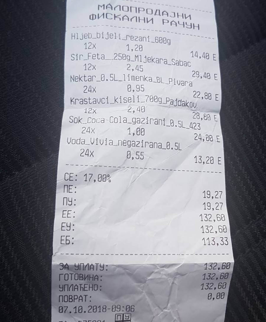 – Od stranke sam dobio pakete u kojima su bili sendviči i jabuke. To sam pojačao hranom i pićem koje sam ja kupio, jer sam pretpostavio da je to malo hrane za oko 20 časova rada. Imam fiskalni račun za sve. Kupio sam 12 tegli krastavaca, 12 hljebova, 12 feta sira, 24 vode, 24 “Kole” i 24 piva. Pivo nisu uzeli svi, podijelio sam samo četiri ili pet. Dan ranije ispekao sam dva praseta od po 30 kilograma. Sve sam to dijelio – priča Grujić, koji nam je dostavio fotogarije hrane i fikslanog računa.