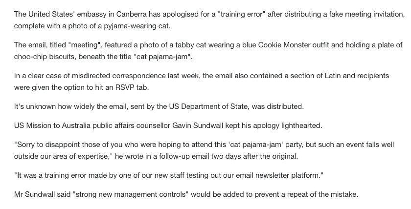 Prema pisanju Asošiejted presa, mejl pod nazivom “sastanak” pozivao je ljude u ime ambasade da dođu na “mačkastu pidžama žurku”, koja je navedena kao domaćin događaja.