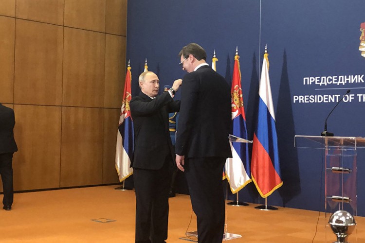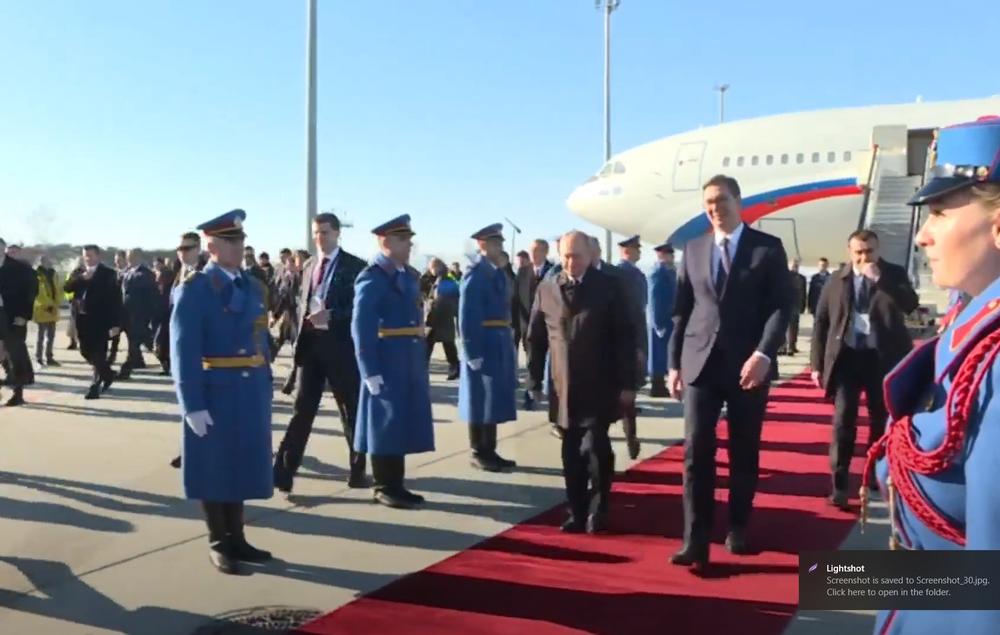 Predsjednik Rusije Vladimir Putin oko 13. 10 sletio je na tlo Srbije, gdje ga je na beogradskom aerodromu dočekao predsjednik Srbije Aleksandar Vučić. Vladimir Putin uručio je Aleksandru Vučiću Orden Aleksandra Nevskog. Naš narod nikada neće zaboraviti šta je Vladimir Vladimirovič uradio 2015. kada je Rusija stavila veto na rezoluciju Britanaca po kojoj bi Srbi bili proglašeni za genocidni narod, poručio je Vučić tokom obraćanja na ruskom jeziku.
