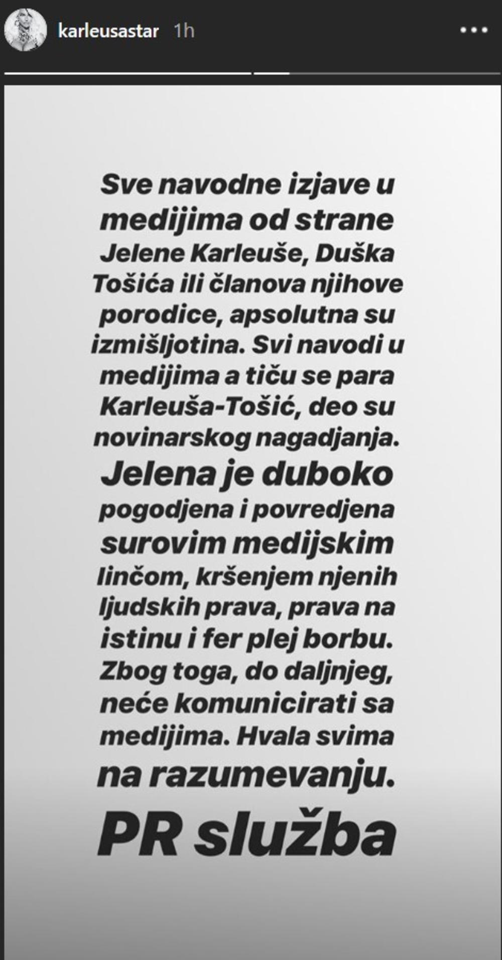 "Sve navodne izjave u medijima od strane Jelene Karleuše, Duška Tošića ili članova njihove porodice, apsolutna su izmišljotina. Svi navodi u medijima, a tiču se para Karleuša-Tošić, deo su novinarskog nagađanja. Jelena je duboko pogođena i povređana surovim medijskim linčom, kršenjem njenih ljudskih prava, prava na istinu i fer plej borbu. Zbog toga, do daljnjeg, neće komunicirati sa medijima. Hvala svima na razumevanju", piše u saopštenju PR službe.