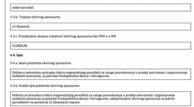 Dobavljač sa kojim bude zaključen okvirni sporazum je dužan dostavljati aviokarte elektronskim putem, a po potrebi na adresu ugovornog organa, a to je Predsjedništvo BiH, stoji u opisu ove nabavke.