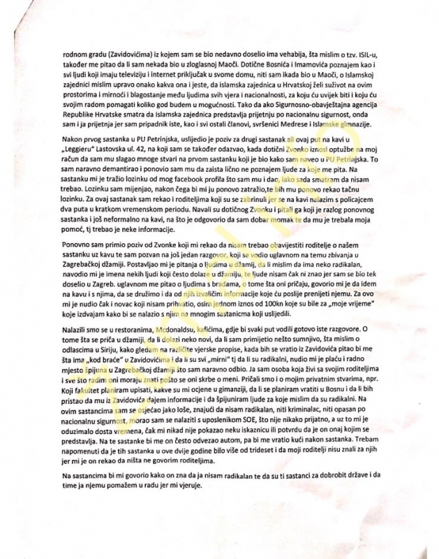 Prigovor na rad radnika SOA-e dostavljen u tu obavještajnu agenciju 19. 7. 2016. godine., na adresu Savska cesta 39/1. Bh. državljanin E.O., rođen u Zavidovićima, tada privremeno nastanjen u Zagrebu, izvijestio je rukovodstvo SOA-e da ga službenik te Agencije tjerao na saradnju, tjerao na druženje sa selefijama, na odlazak u Gornju Maoču i Bočinju, te konstantno vršio pritisak na njega da se druži sa pripadnicima selefijkog pokreta.