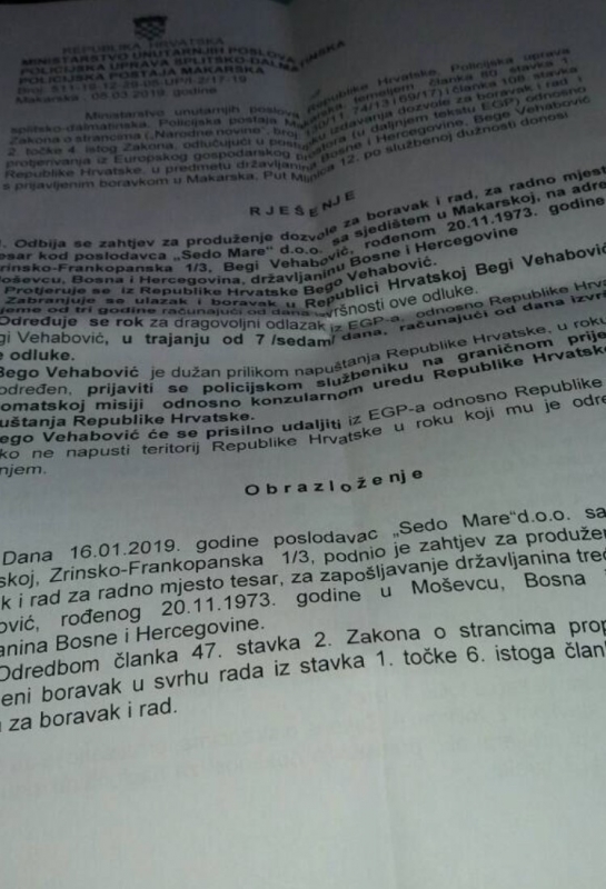 Bh. državljanin Bego Vehabović imao je urednu dozvolu za rad i boravak na teritoriji Republike Hrvatske. Kada je njegov poslodavac u februaru ove godine poslao zahtjev za produženje dozvola, Bego je pozvan u policiju, gdje su s njim razgovarali službenici SOA-e. Tražili su od njega informacije o teroristima u BiH i pripadnicima tzv. Armije RBiH.
