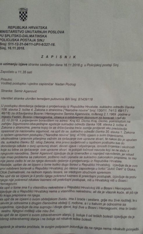 Bh državljanin Semir Aganović, tesar iz Travnika, u oktobru 2018. godine dobio je dozvolu za rad i boravak na teritoriji Republike Hrvatske. Dvadeset dana kasnije, pozvan je u prostorje MUP-a gdje je razgovarao sa službenicima SOA-e koji su od njega tražili informacije o selefijama u BiH i pripadnicima Armije BiH. Nakon što je odbio dati ove informacije, Aganović je protjeran iz Republike Hrvatske pod optužbom da je opasnost za naconalnu bezbjednost tezemlje zbog svojih veza sa teroristima.