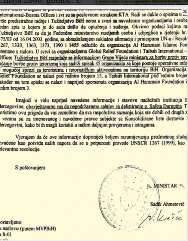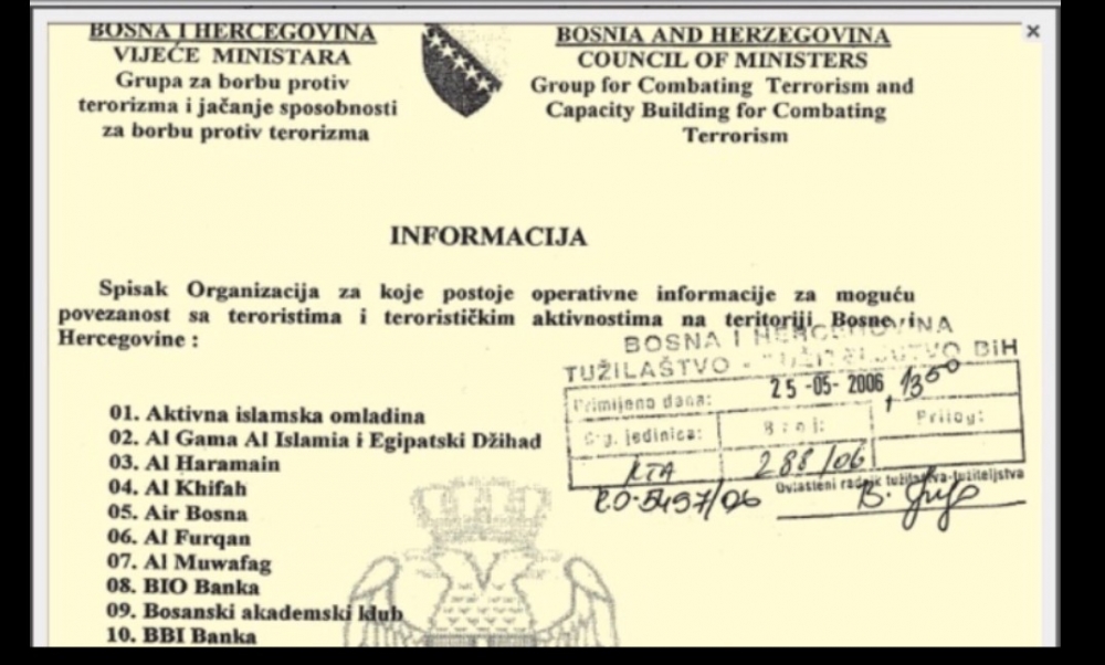 „Tužilaštvo BiH raspolaže informacijom Grupe za borbu protiv terorizma koja sadrži spisak 45 organizacija za koje postoje operativne informacije da su u mogućoj sprezi sa teroristima i terorističkim aktivnostima na teritoriju BiH“, navedeo je Krešić. (dokument 1)