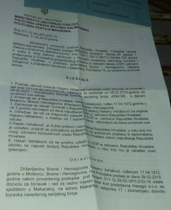 Nakon što im je kazao da nema šta da kaže – izdato je rješenje o njegovom protjerivanju s teritorije Republike Hrvatske, jer prema stavu službenika SOA-e, zbog svojih veza sa teroristima u BiH, Bego Vehabović predstavlja opasnost za nacionalnu bezbjednost te države.