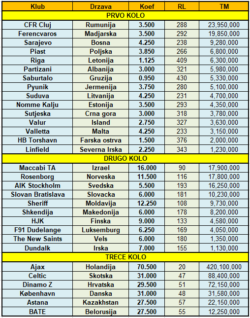 TREĆE KOLO:Ajaks (Holandija), Seltik (Škotska), Dinamo Zagreb (Hrvatska), Kopenhagen(Danska), Astana (Kazahstan), BATE Borisov (Belorusija).