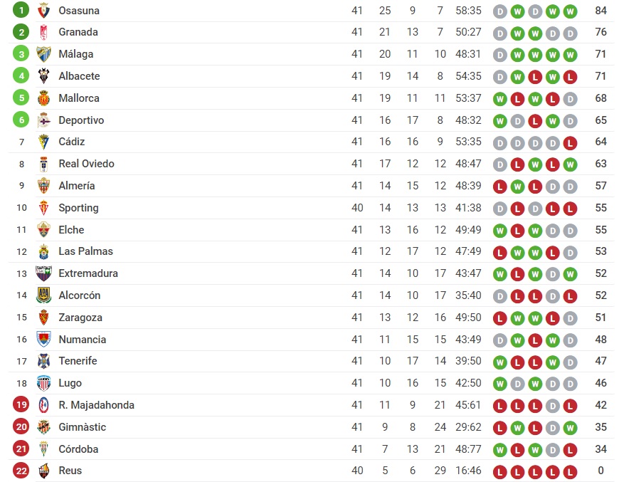 Podsetimo, još ranije direktan plasman u Primeru obezbedila je Osasuna, pa sada ostaje da kroz plej-of dobijemo i poslednjeg, trećeg novajliju. U poslednjoj rundi, 8. i 9. juna znaćemo da li će kao šestoplasirani tim u doigravanje Deportivo, Ovijedo ili Kadiz. Mesto u Top 6 od već su osigurali Malaga, Albasete i Majorka. Trećeplasirani će igrati sa šestoplasiranim, četvrtoplasirani sa petoplasiranim, posle čega će pobednici odlučiti ko ide u elitu...