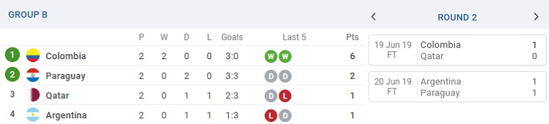 U Grupi B Katar je na trećem mestu, jer ima bolju gol razliku, dok je Kolumbija prva sa maksimalnih šest bodova, a Paragvaj sa dva drugi.