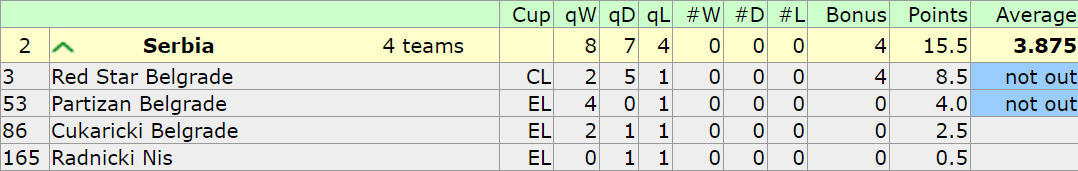 Srbija je trenutna druga u Evropi po osvojenim bodovima na nacionalni koeficijent (3,875), iza Škotske, ali to je zato što klubovi iz onih najjačih liga tek treba da se uključe u takmičenja...