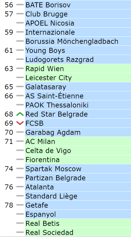 Samo sa ova četiri obezbeđena boda Crvena zvezda je već zabeležila ogroman rast na UEFA rang listi klubova. Podsetićemo da su Beograđani sezonu počeli na 88. poziciji, a trenutno su 68. To je, dakle, skok od celih 20 mesta. Zvezda je trenutno na 20,750 bodova. Zanimljivo je bilo uporediti gde bi srpski prvak bio na ovosezonskim žrebovima sa tim novim koeficijentom. Čista projekcija: u trećem kolu kvalifikacija za Ligu šampiona i dalje ne bi bila nosilac (APOEL sa 25,500 bio je poslednji povlašćeni), ali zato bi u plej-ofu za Ligu Evrope. I to bez problema. Podvlačimo, ovo je čista projekcija, primer. Do kraja evropske sezone još će se dosta toga menjati na Uefinoj listi. Ispod Zvezde su neki klubovi koji će evidentno napredovati, a iznad su pojedini koji ni ne igraju Evropu, ili su već eliminisani, pa će padati...
