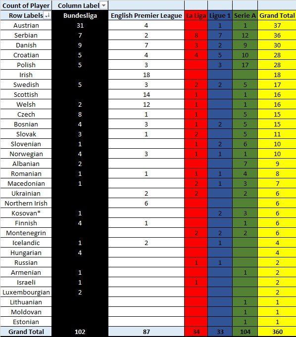 Treba napomenuti da Austrija ima 31 fudbalera u Bundesligi, a nijednog u LaLigi, što je i očekivano s obzirom na govorno područje. Isto tako Irci imaju ukupno 18 fudbalera i svi nastupaju u Premijer ligi, a slično je i za Škote i Velšane.