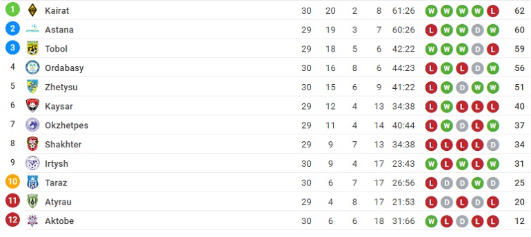 Astana je danas u meču sezone okrenula sve u svoju korist. Savladala je direktnog rivala Kairat sa 3:1 i četiri kola pre kraja sve drži u svojim rukama. Ako pobedi svaki meč do kraja, odbraniće titulu. Trenutno je Astana druga sa dva boda manje od Kirata ali ima i utakmicu manje. Do kraja dočekuje Aktobe i Irtiš i gostuje Okžetpešu i Tobolu što je najozbiljniji ispit do kraja sezone. Osim što je Astana danas u direktnom duelu sprečila Kairat da se odlepi, na ruku joj je išao i rezultat pomenutog Tobola koji je do danas imao dva boda više. Ipak, danas je na svom terenu poražen od Ordabasija 1:2 i propustio je veliku šansu za prvo mesto.