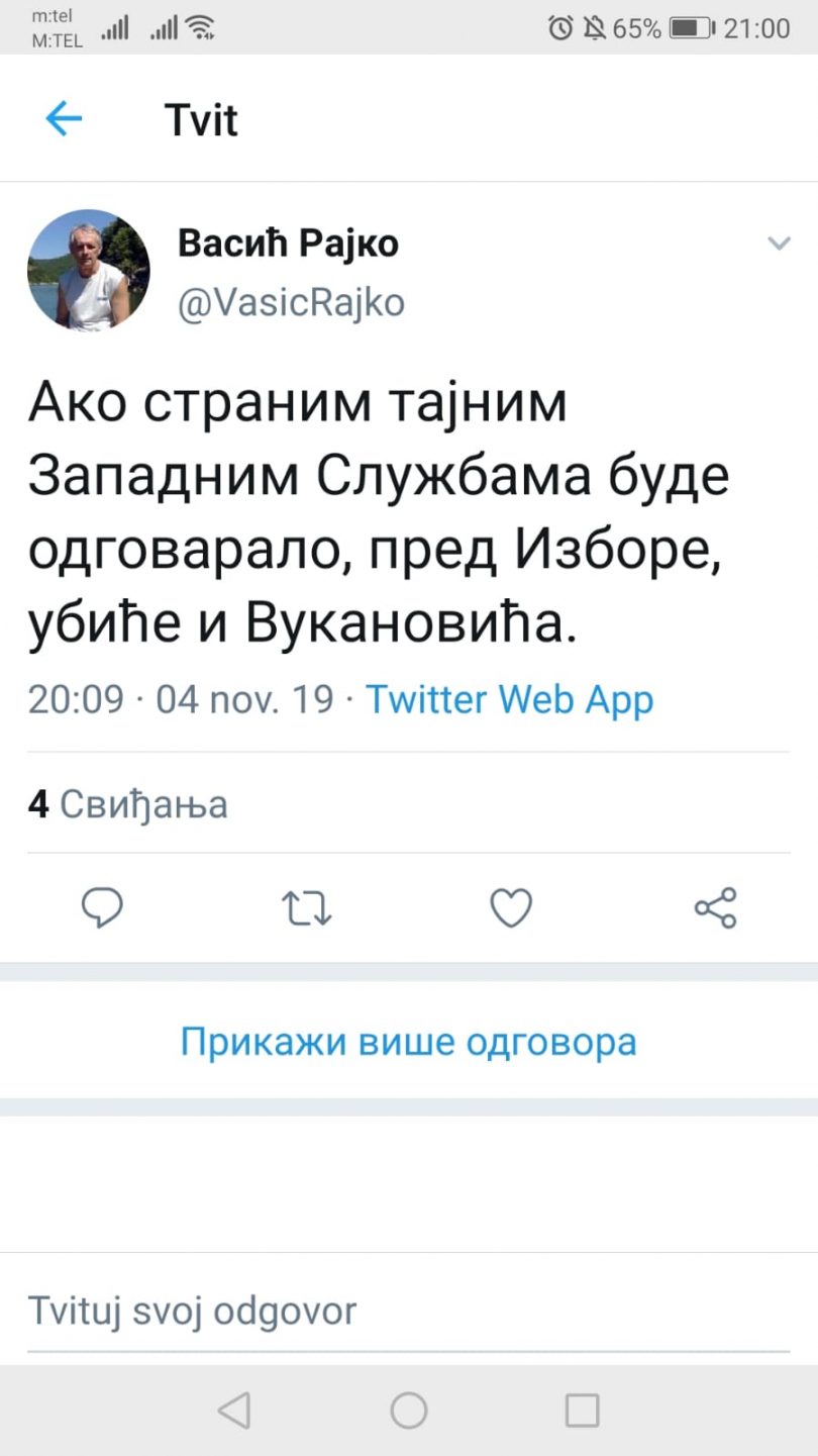 Vasić je na svom Twitter nalogu napisao: “Ako stranim tajnim Zapadnim Službama bude odgovaralo, pred Izbore ubiće i Vukanovića“.