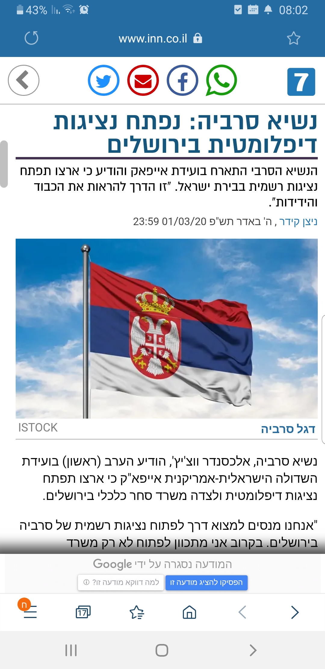 Od medija na hebrejskom i engleskom jeziku Nikolić je izdvojio: i24 News (https://www.i24news.tv/en/news/israel/diplomacy-defense/1583098533-serbia-s-vucic-announces-intention-to-open-official-state-office-in-jerusalem), nacionalno-religiozne provinijencije Aruc (Arutz) 7 (http://www.israelnationalnews.com/News/News.aspx/276670), a posebno intervju predsjednika Srbije međunarodno renomiranom Džeruzalem (Jerusalem) Post-u (https://www.jpost.com/Israel-News/Serbian-pres-tells-Post-he-plans-to-buy-weapons-from-Israel-619454).
