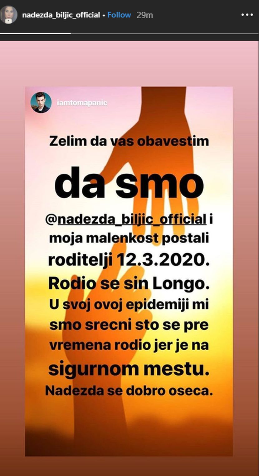 - Želim da vas obavestim da smo Nadežda i ja postali roditelji 12.03.2020. Rodio se sin Longo. U svoj ovoj epidemiji mi smo srećni što se pre vremena rodio jer je na sigurnom mestu. Nadežda se dobro oseća - napisao je Toma na svom Instagram profilu, a to isto podelila je na svom nalogu i Nadežda.