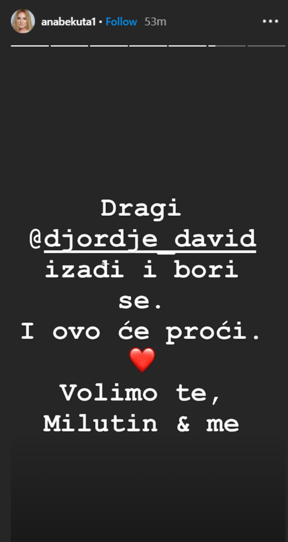 "Dragi Đorđe, izađi i bori se. I ovo će proći. Volimo te Milutin i ja", napisala je Ana Bekuta.