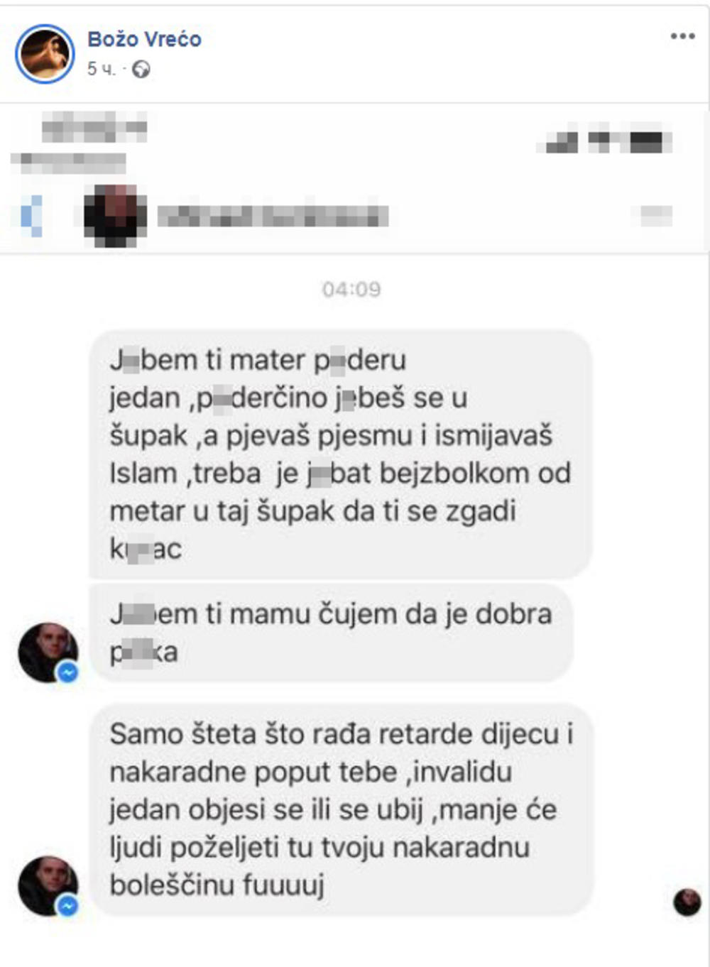 "Mili moji, delim vam i ovo, moje jutro je započelo prijavom u policiji zbog pretnji smrću koje su mi došle. Sve je evidentirano i proces tek sledi. Sve je to atak samo na mene, na moju intimu, na moju umetnost, na moj odgoj, na moj intelekt, na moju slobodu, atak na čoveka koji nikad nikom ružno nije pomislio i neće, čak ni u ovom trenu. Ne mogu vam opisati taj osećaj kada vas neko kome ništa nažao niste učinili toliko vređa, poziva na linč i priželjkuje vašu smrt, pritom ono što me sigurno najviše pogodilo jeste grozno vređanje moje majke, pogledajte kakvim smo to monstrumima okruženi, pogledajte taj vokabular i primitivnost, zar može gore, podlije i gnusnije od ovog, u šta su se to ljudi pretvorili?!", napisao je Vrećo na svom Fejsbuk profilu, a fanovi su odmah stali u njegovu odbranu.