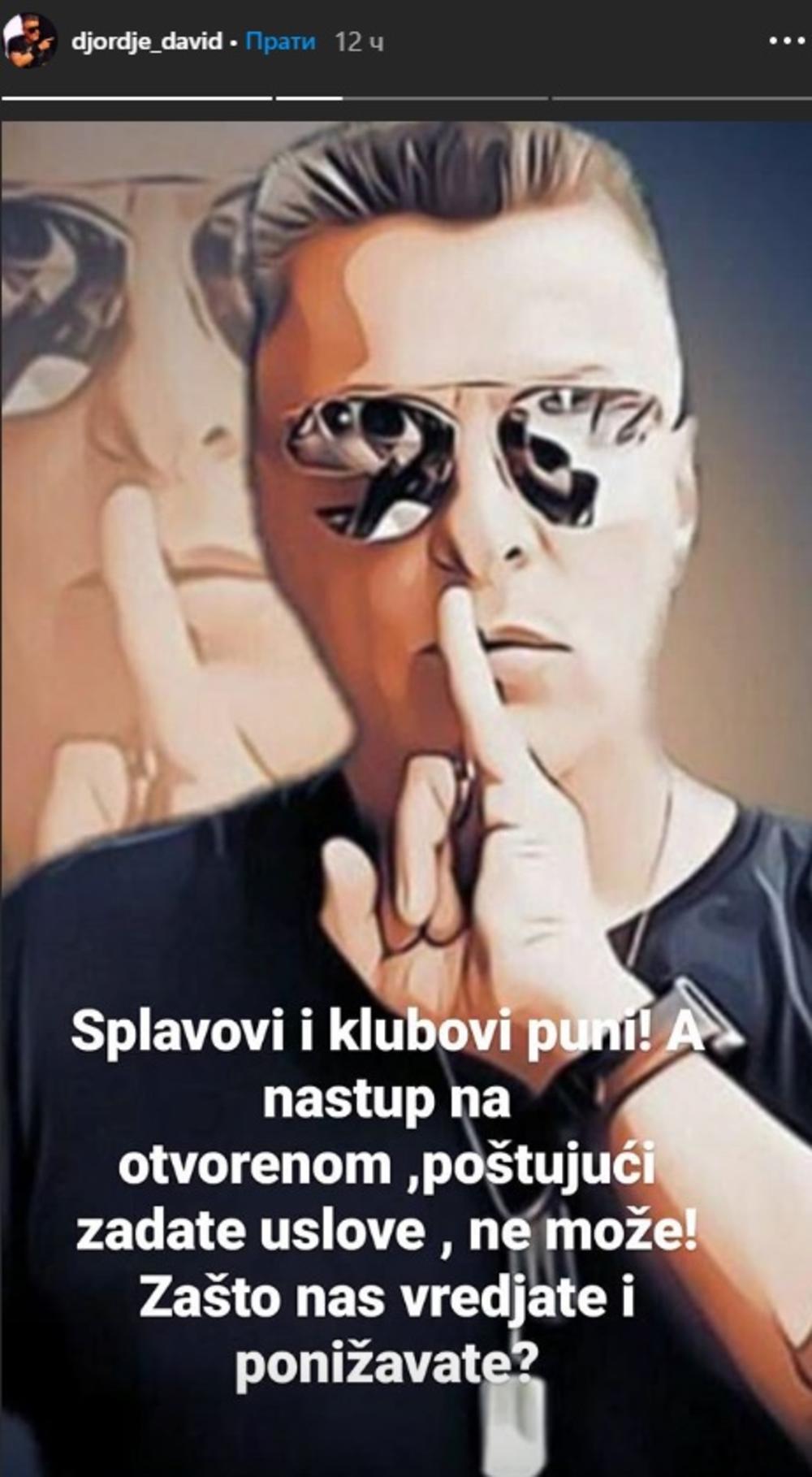 - Dva nastupa su nam u oktobru otkazali zbog loše epidemioliške situacije! Splavovi i klubovi puni, a nastup na otvorenom, poštujući zadate uslove, ne može! Zašto nas vređate i ponižavate - napisao je Đorđe, ne navodeći gde je imao zakazane nastupe ovog meseca.