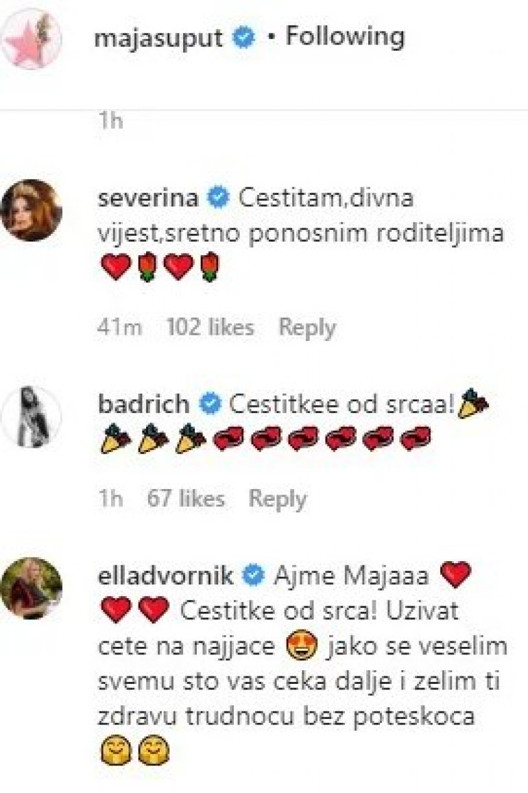 - Iznenađenje! Dragi moji, od svih objava i najava, imam puno veću vest od svih dosadašnjih. Ova je za nas najlepša, najčudesnija i toliko magična da vam ne mogu opisati naše osećaje. Naime u našu malu ali prepunu ljubavi porodicu, dolazi prinova kao najveći dar i kao karika koja je bila oduvek željena i samo je još ona nedostajala za naš svemir. Malo je reći da smo oboje na 7. nebu i da je reč uzbuđenje doseglo novu dimenziju. Napokon je došao trenutak da vam otkrijemo slatku tajnu i da beba ima prvu foto uspomenu na rast u maminom trbuščiću... Danas slavimo 15 nedelja u nadi da ce sledećih 25 proći ovako lepo i sigurno za nas - napisala je Maja, a odmah je usledilo mnogo čestitki, među kojima su se našle i Severina i Nina Badrić.