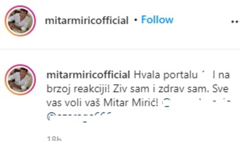 Pevača je ovo mnogo potreslo i odmah je odlučio da pravdu potraži na sudu. - Čime se sve ljudi služe, strašno! Mitar je živ i zdrav. Ovo je lažna vest! Sad ćemo malo da se igramo na sudu sa ovima koji objavljuju lažne vesti. Ne može nam niko ništa - glasio je odgovor Mirićevog PR tima na njegovoj zvaničnoj stranici na Fejsbuku.