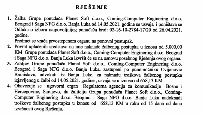Kancelarijau za razmatranje žalbi prihvatila je žalbu „Planet Softa“ i poništila odluku o izboru ponuđača, a RAK-u naložila da donese novu odluku.