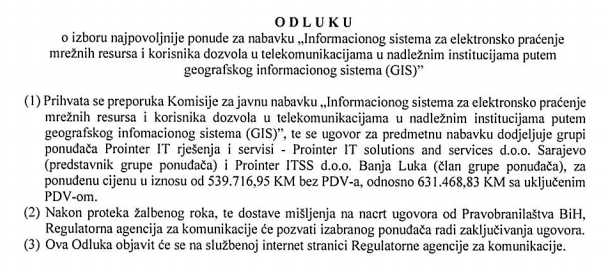 RAK odlučuje da tender dodijeli „Prointeru“, jer je referenca „Planet Softa“ ocijenjena „neispravnom“. Radi se o referenci za sličan posao koju je grupi „Planet Softa“ izdalo preduzeće „Putevi Brčko“, a za koju je RAK ocijenio da se odnosi samo na implementaciju GIS-a, ali ne i na razvoj tog sistema.
